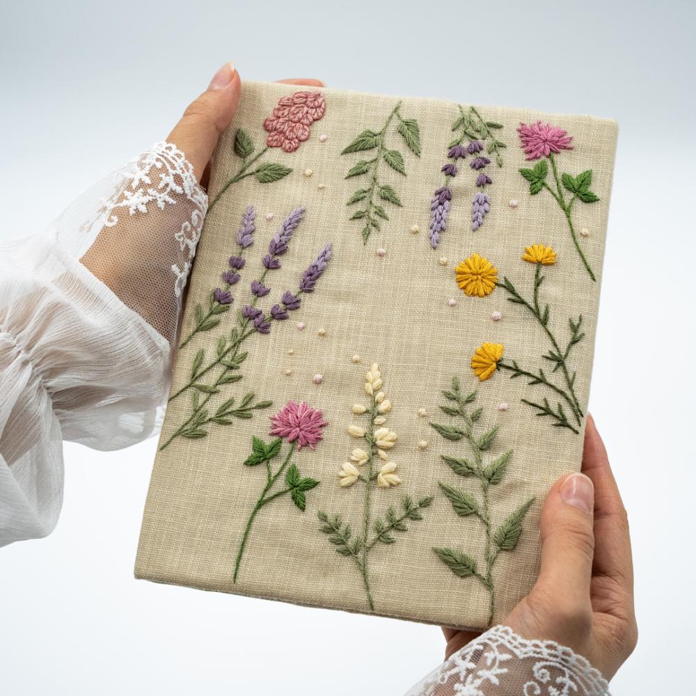 دفتر مذكرات بغلاف يزهر بـ لافندر ناعم، أقحوان مشرق، وزهور برّية دافئة.